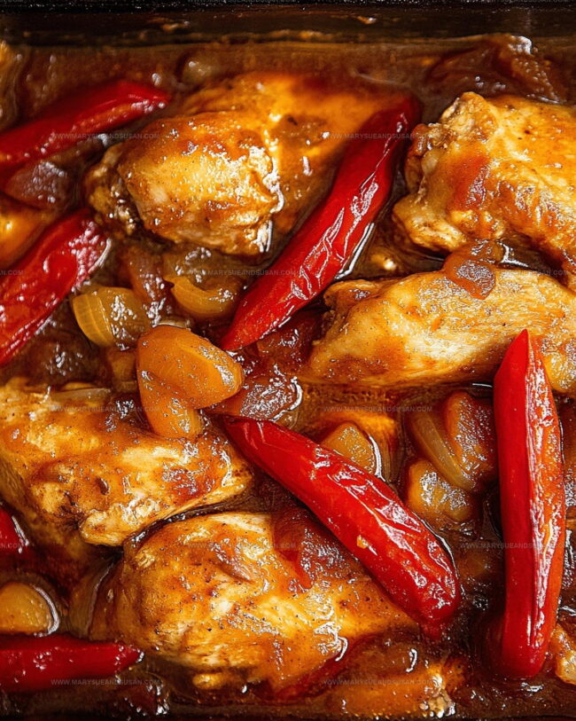 Remove the foil, baste the dish again, and return to the oven. Bake uncovered for an additional 15 minutes, allowing the peppers to caramelize and the sauce to develop a rich color. Serve the chicken hot and enjoy the amazing flavors you’ve created!