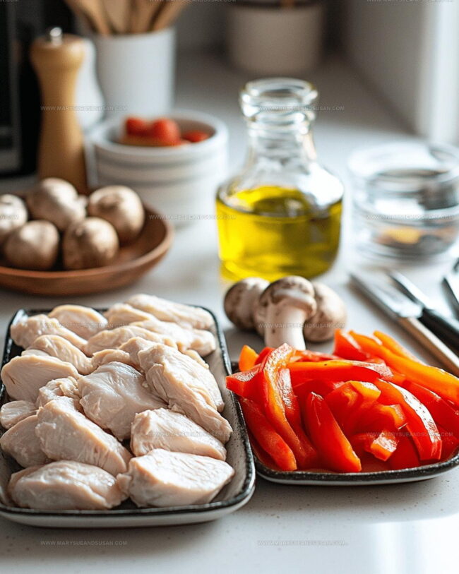 - Layer 2 sliced red bell peppers over the chicken and mushrooms.