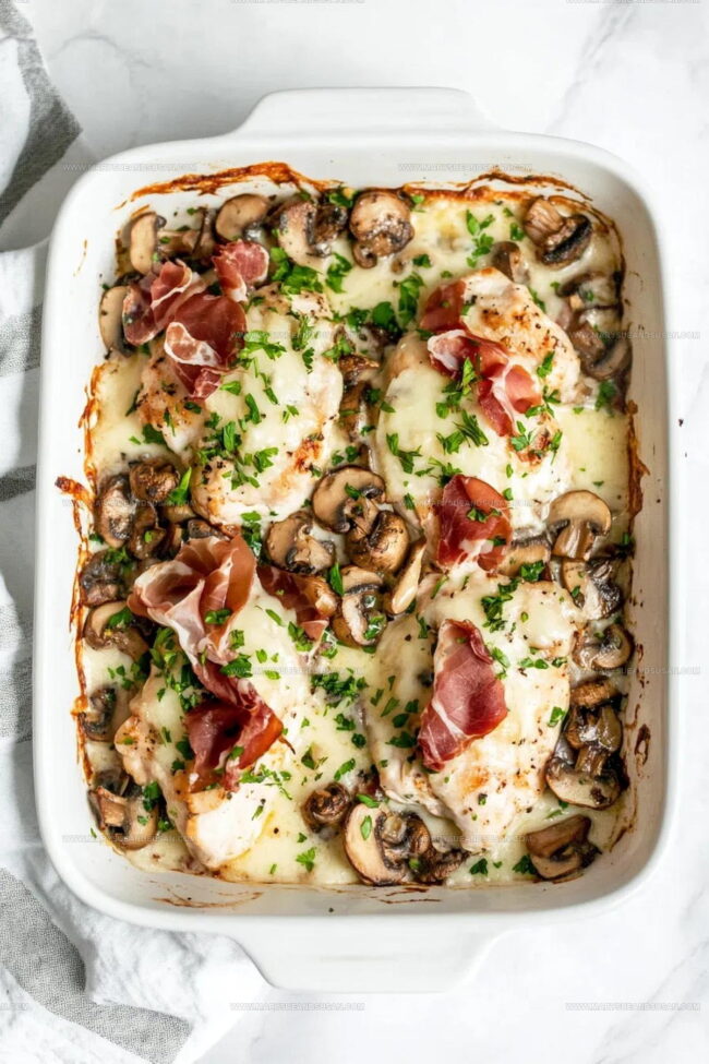 - Sprinkle ¾ cup sliced button mushrooms and 2 tablespoons diced prosciutto across the chicken, then completely cover with 8 ounces shredded provel cheese.