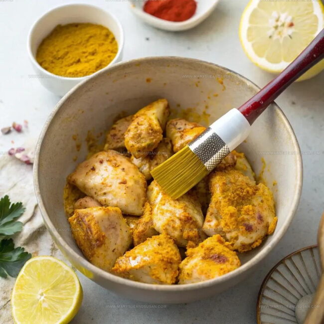 Grab a big mixing bowl and toss in your yogurt, lemon juice, and all those incredible spices. Mince the garlic and grate that fresh ginger right into the mix. Sprinkle in salt and stir everything until smooth. Drop in 1 lb of chicken pieces and massage that marinade all over them. Cover the bowl and park it in the refrigerator for 30 minutes.