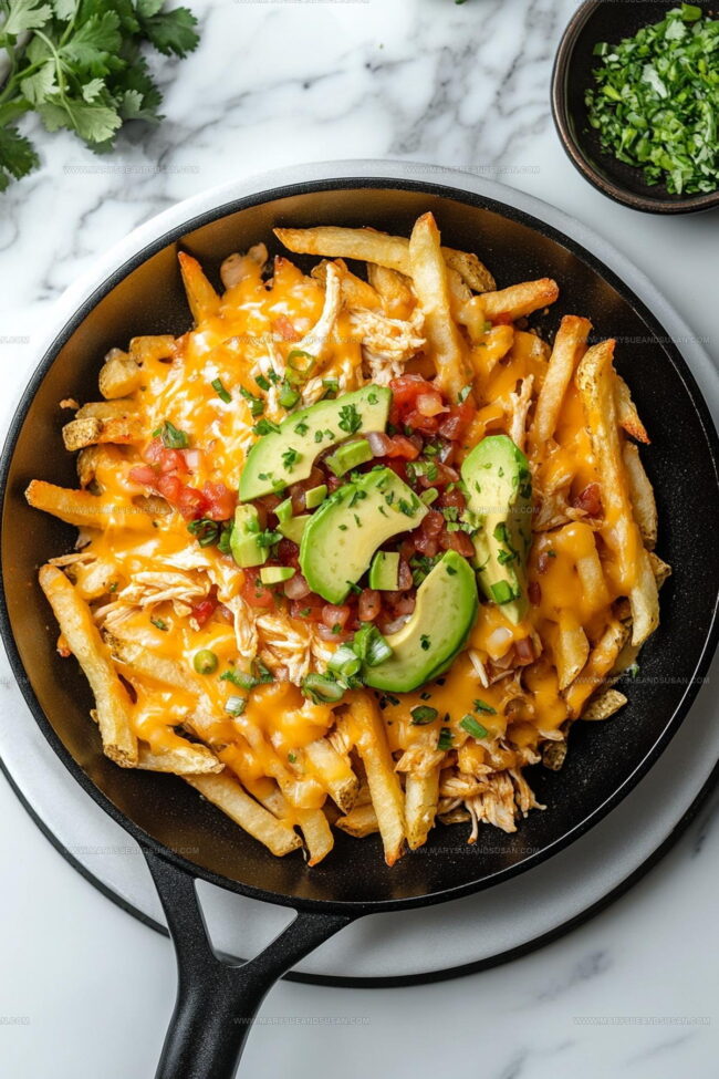 Spread the crispy fries on a plate. Top with shredded chicken, pour over the cheese sauce, and garnish with salsa, green onions, and sliced avocados. Your epic meal is ready!