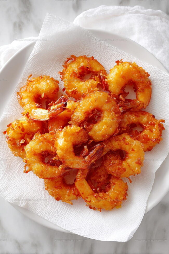 Transfer cooked shrimp onto paper towels to remove excess oil. Repeat the cooking process with remaining shrimp until all are crispy and delicious.