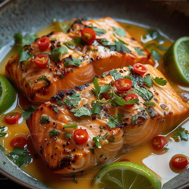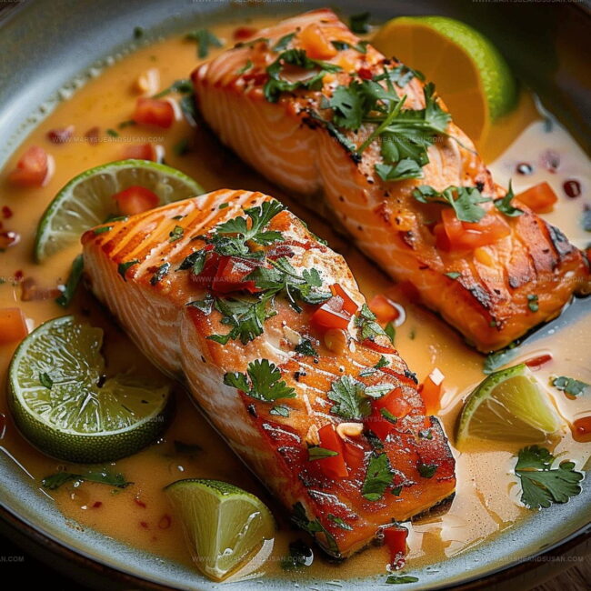 Remove the skillet from heat. Sprinkle fresh cilantro or parsley on top. Serve the salmon with extra sauce, alongside rice or steamed vegetables. Add lime wedges for an extra burst of flavor.