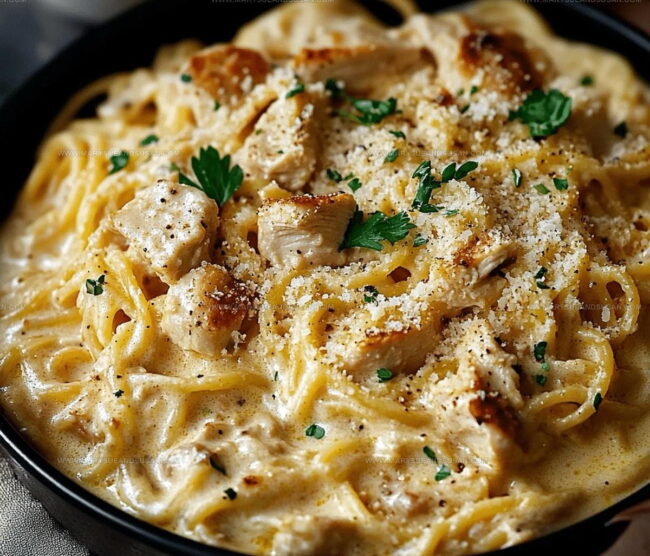 Pour the sauce over your cooked spaghetti and shredded chicken. Toss everything gently until the pasta and chicken are completely coated with the creamy mixture.