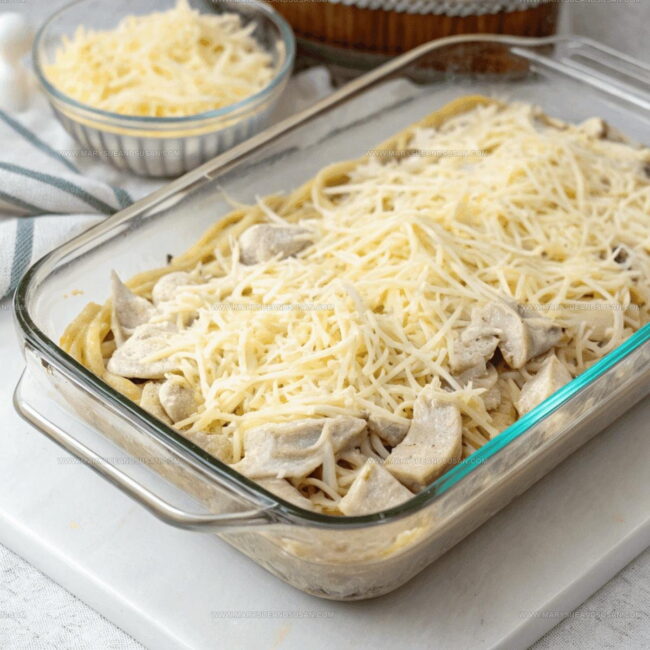 Fold in 2 cups of cooked, shredded chicken and your prepared pasta. Make sure every strand gets coated in that creamy sauce. Transfer the entire mixture to a greased 9×13-inch baking dish.
