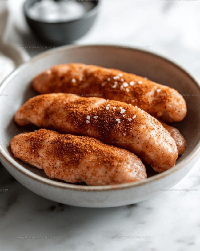 - Dust each chicken tender thoroughly with the spice mixture, covering both sides completely.