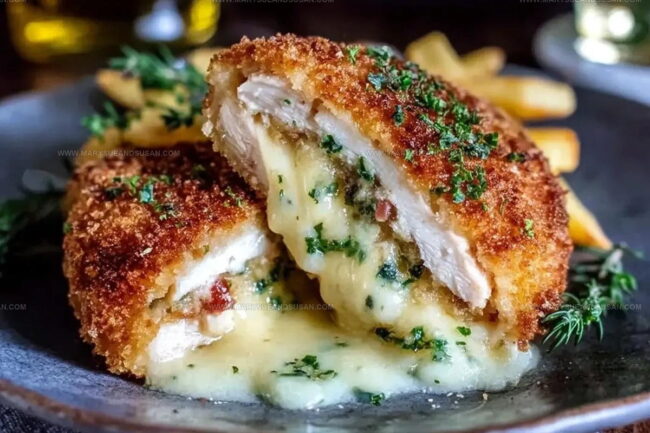 The key is chilling the rolled chicken before breading. After you wrap the butter inside the chicken, refrigerate for 30 minutes so the butter firms up. This helps seal the edges and prevents melting too quickly.