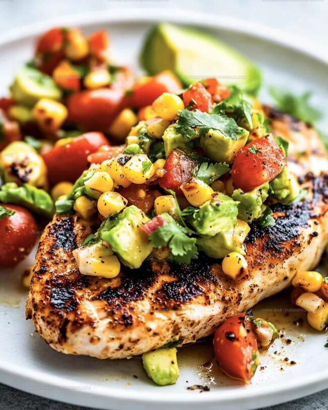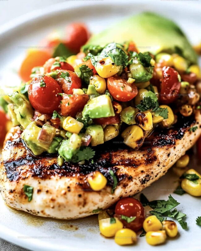 Just before serving, gently fold in 2 chopped avocados. Taste and adjust seasonings if needed. Slice your chicken and serve topped with this fresh, zesty salsa.