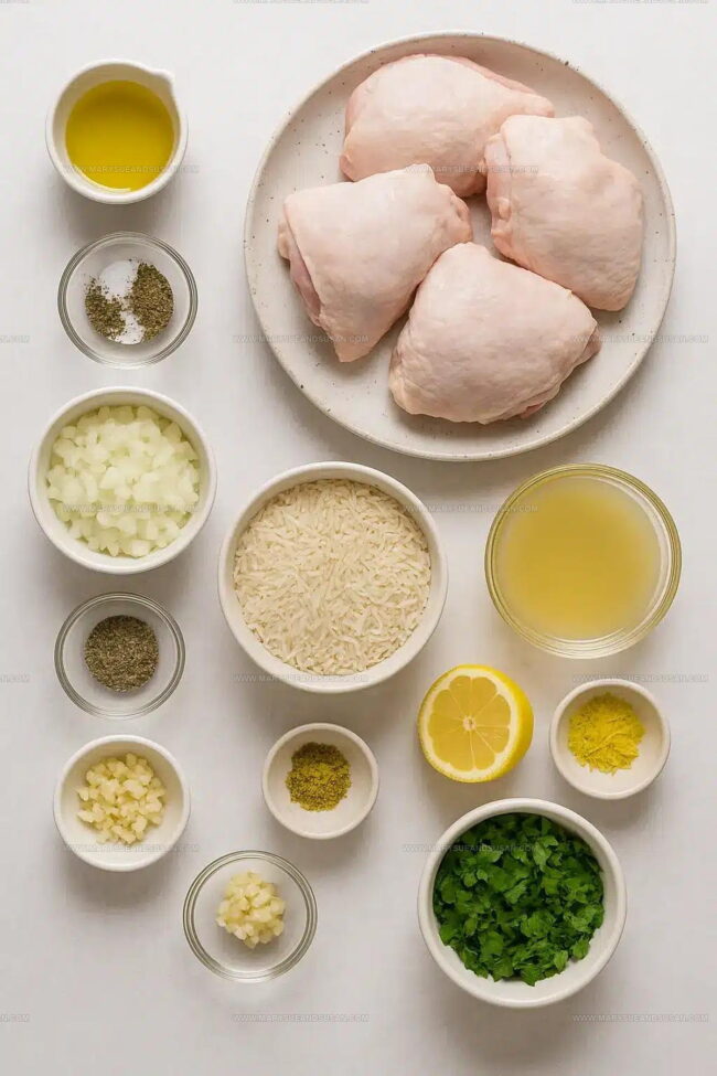 Main Protein:Seasoning for Protein:Cooking Fat:Aromatic Base:Rice and Liquid Components:Citrus Elements:Finishing Touch:Tools Supporting Fluffy Rice and Tender Chicken