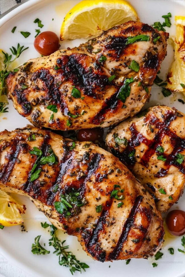 Transfer grilled chicken to a serving plate. Sprinkle 1 tablespoon fresh chopped parsley over the top and add a few small lemon wedges on the side for an extra burst of freshness.
