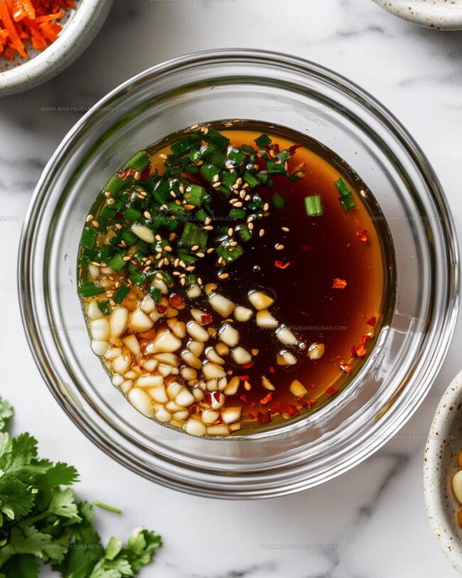 - Whip together ½ cup olive oil, ½ cup soy sauce, ¼ cup vinegar, ¼ cup honey, ¼ teaspoon red pepper flakes, 1 tablespoon Dijon mustard, 1 teaspoon salt, 2 minced garlic cloves, and 2-3 drops sesame oil in a mixing bowl.