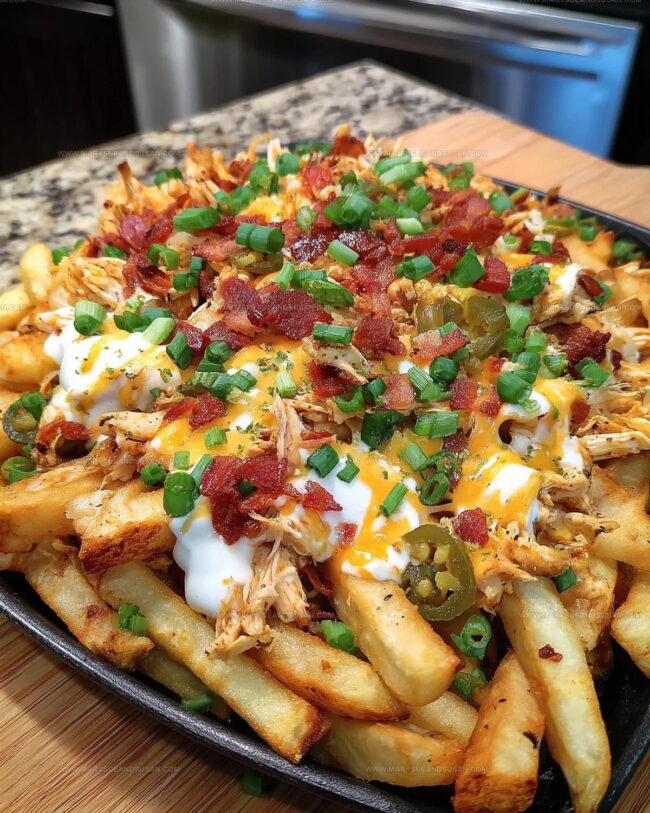 - Drizzle ¼ cup ranch dressing across the top of the loaded fries just before serving.