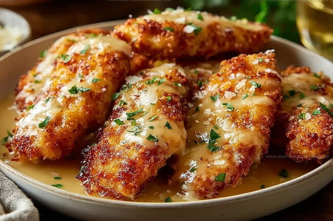 Arrange those crispy chicken tenderloins on plates and generously drizzle the creamy lemon sauce over the top. If you’re feeling fancy, sprinkle some extra Pecorino cheese or fresh herbs for a pop of color.
