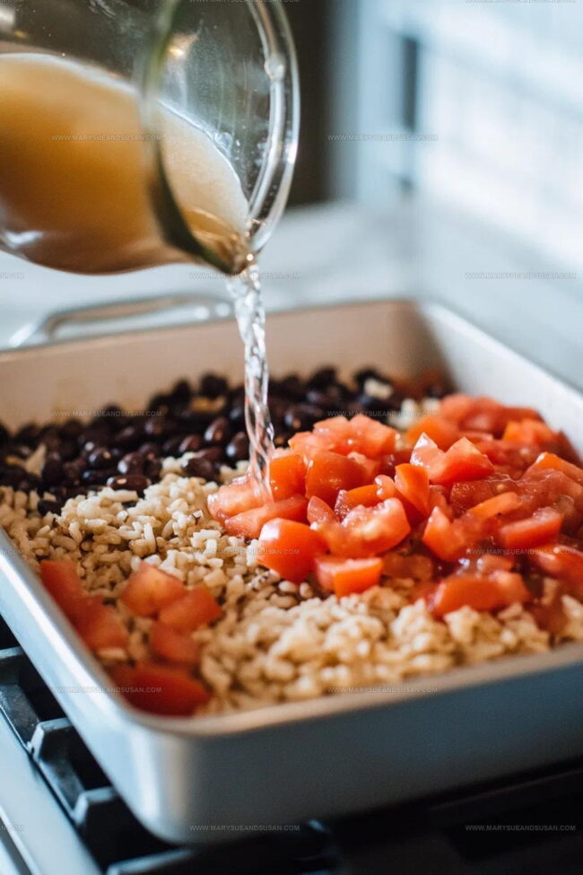 - Pour the entire box of black beans and rice into the dish, then gently mix with the seasoning until well combined.