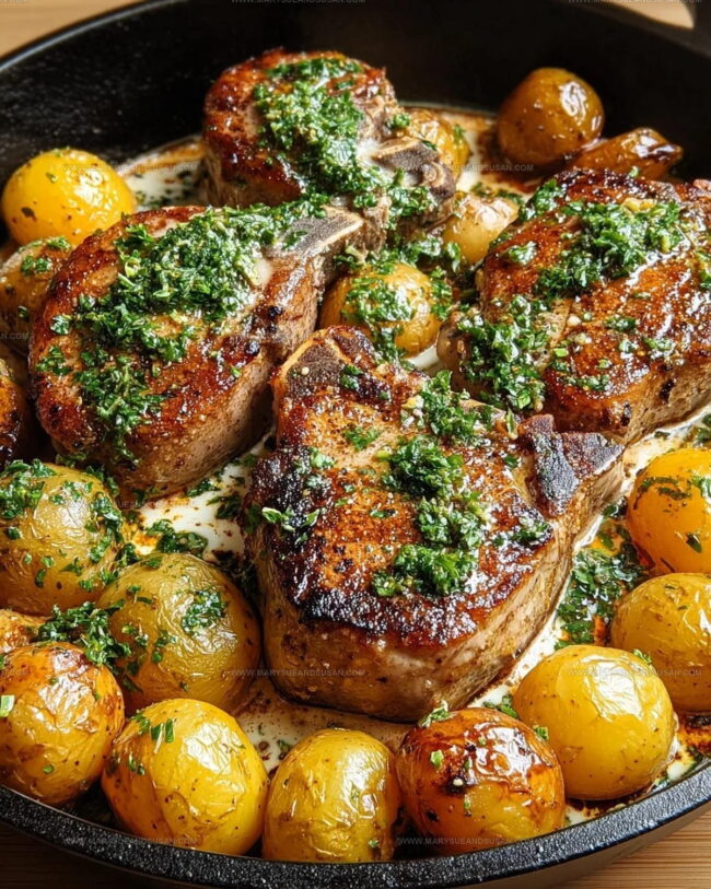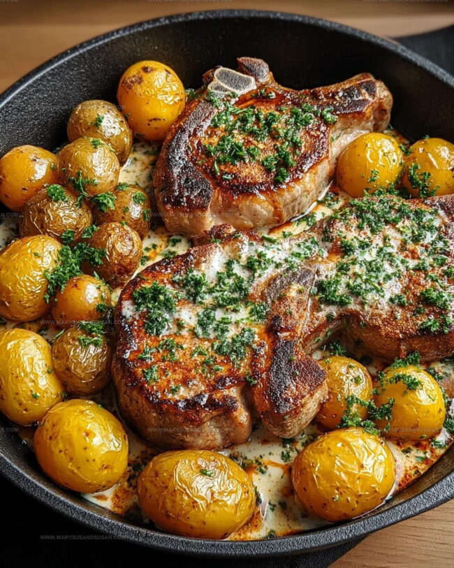 - Gently return seared pork chops to the skillet, nestling them into the creamy potato mixture.