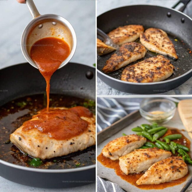 Slide the skillet into the preheated oven. Bake for 20-25 minutes until the chicken reaches 165°F at its center. Halfway through cooking, splash some extra sauce over the chicken to keep it super juicy.