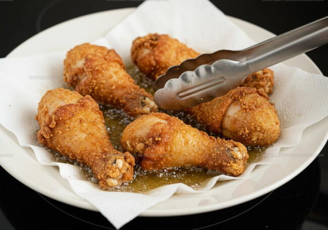 - Transfer fried chicken to a paper towel-lined plate to drain excess oil. Serve hot with your favorite dipping sauce.