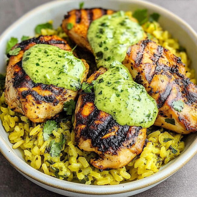 Fluff the rice with a fork and spread it across your serving plates. Slice the chicken breasts and arrange them over the rice. Drizzle that vibrant green sauce generously on top. For an extra pop of freshness, sprinkle some chopped cilantro or add a lime wedge on the side.