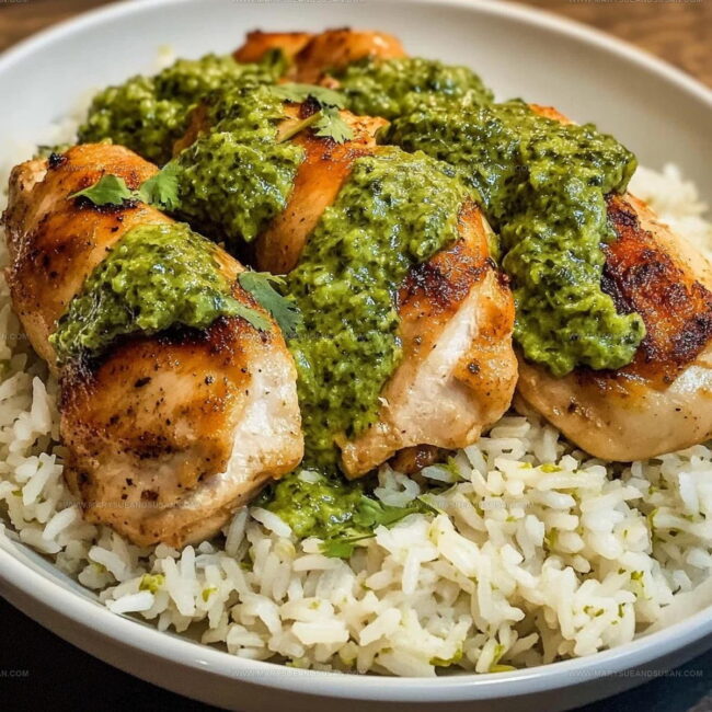 Plate your rice, top with grilled chicken, and drizzle that vibrant green sauce all over. Dinner is ready in about an hour!