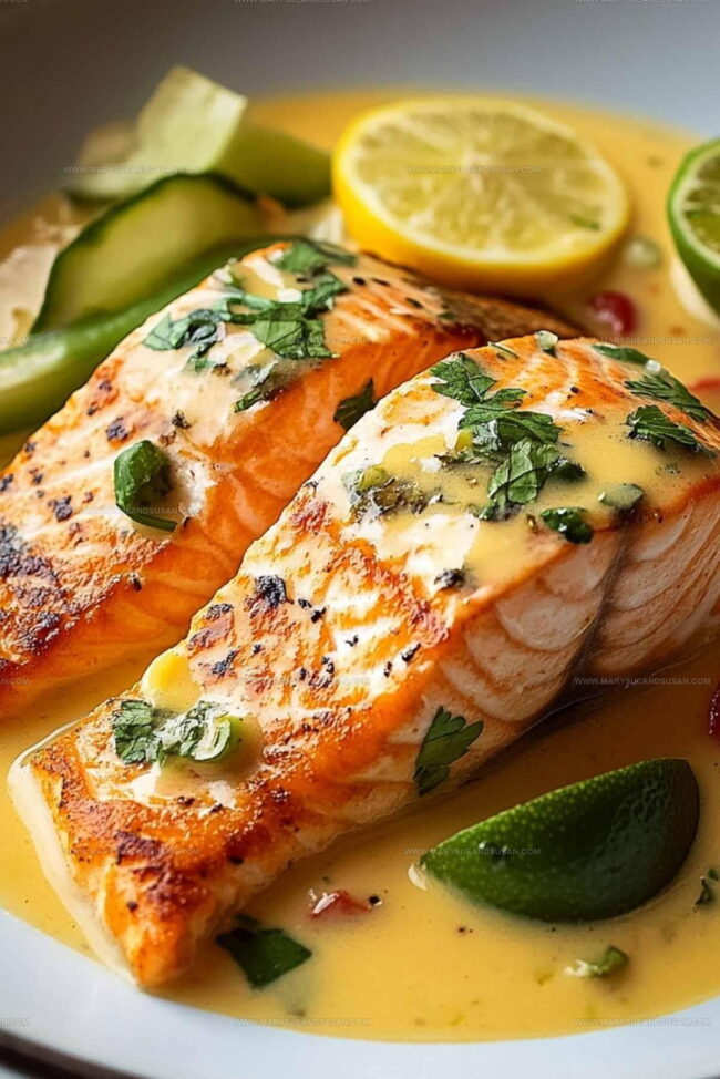- Ladle the fragrant coconut lime sauce generously over each salmon fillet. Sprinkle fresh chopped cilantro on top and place a lime wedge alongside for an extra zesty touch.