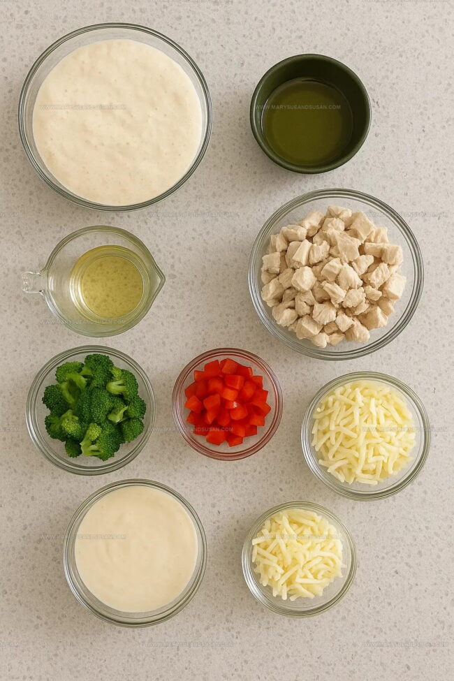 - Distribute 1 cup diced chicken, 1 cup broccoli florets, and ½ cup diced red bell peppers evenly across sauce.