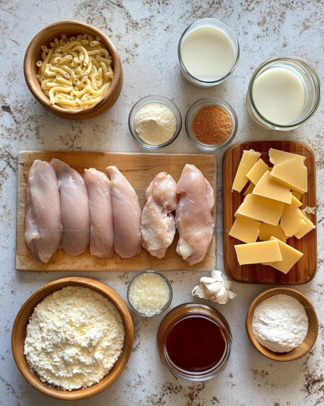 Proteins:Spices and Seasonings:Sauce and Cheese Components:Common Prep Tools for Honey Pepper Chicken Mac and Cheese