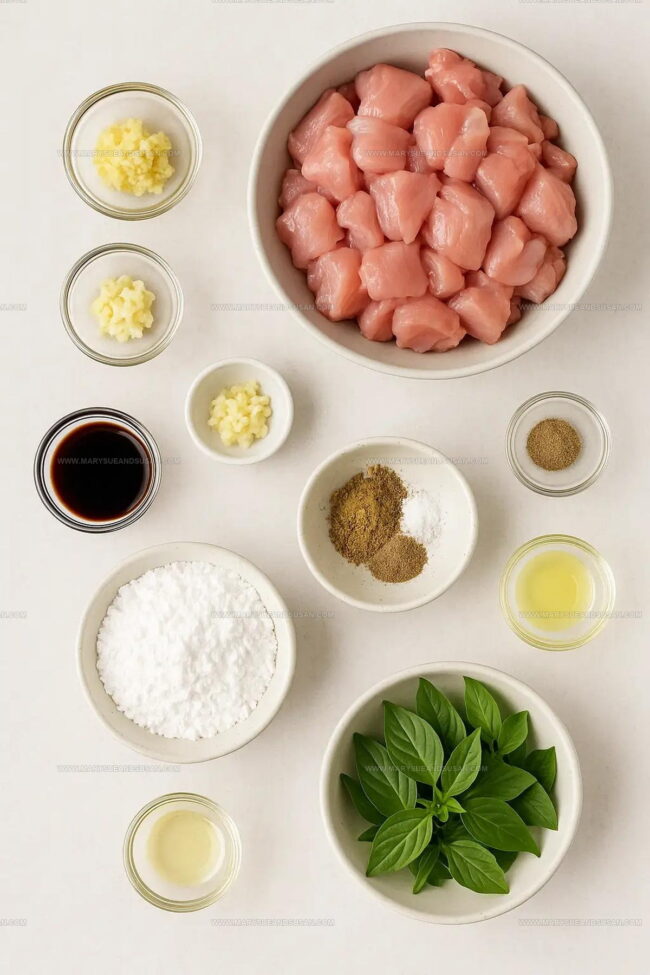 Grab your chicken thighs and chop them into 1–2 inch chunks. In a mixing bowl, combine the chicken with: